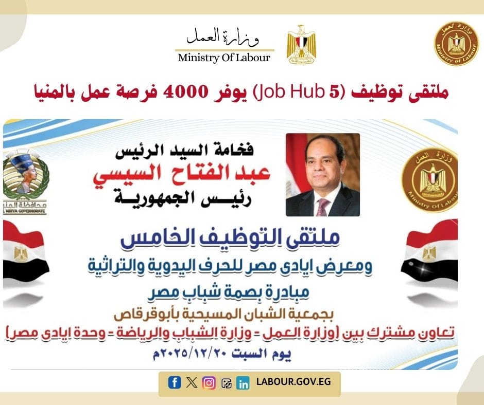 وفي سياق آخر، أعلنت مديرية عمل المنيا عن تنظيم ملتقى التوظيف الخامس بمركز أبوقرقاص، بمشاركة 40 منشأة توفر 4000 فرصة عمل.