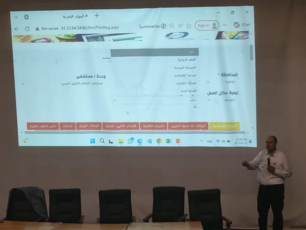 وحضر التدريب الأستاذة منال مأمون، رئيس الإدارة المركزية للموارد البشرية، والمهندس محمد جاد، القائم بالإشراف على الإدارة العامة للإحصاء والتقارير والنشر الإلكتروني، والدكتورة إيناس النحاس، رئيس الإدارة المركزية للشؤون الإدارية والموارد البشرية برئاسة الهيئة، والأستاذة حنان فؤاد، مدير إدارة وتنمية المواهب بالهيئة العامة للتأمين الصحي، في إطار دعم تطوير الأداء المؤسسي وتحسين إدارة الموارد البشرية بالقطاع الصحي.