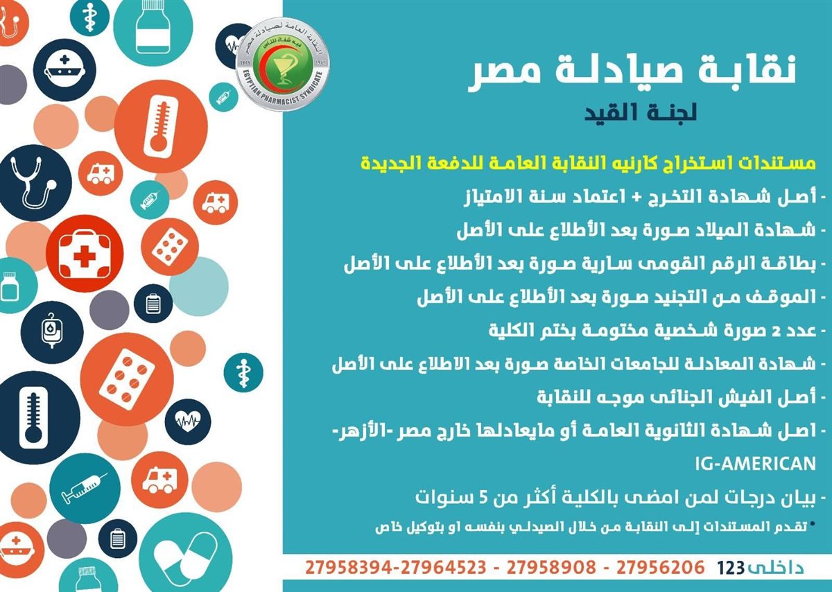 وأوصحت نقابة الصيادلة، أن المستندات المطلوبة للقيد بالنقابة لخريجي الجامعات الحكومية والخاصة، وكذلك الجامعات الأجنبية خارج مصر، بالإضافة إلى الأوراق المطلوبة لاستخراج ترخيص مزاولة المهنة كالتالى: