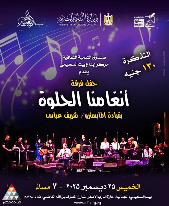 يقيم مركز إبداع بيت السحيمى بشارع المعز، يوم الخميس المقبل الموافق 23 ديسمبر 2025، حفلاً غنائياً جديداً لفرقة “أنغامنا الحلوة” ضمن برنامج النشاط الفني الذي ينظمه قطاع صندوق التنمية الثقافية برئاسة المعمارى حمدي السطوحي، وذلك فى تمام الساعة السابعة مساءً.