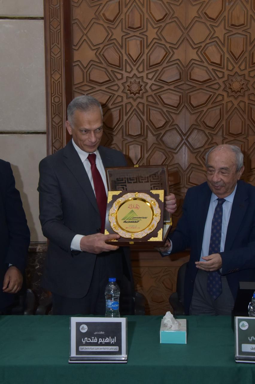 وفي ختام الحفل حرص المهندس طارق النبراوي والمهندس ابراهيم فتحي على تبادل درع نقابة المهندسين ودرع شركة مصر للطيران للصيانة والأعمال الفنية.