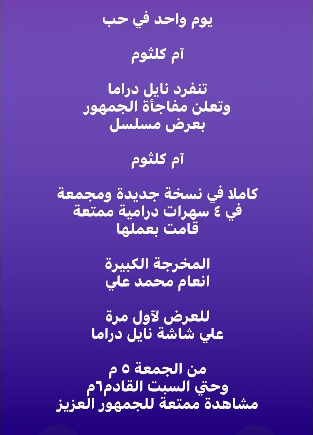 سيُعرض المسلسل والذي يروي سيرة حياة الفنانة الكبيرة كوكب الشرق أم كلثوم، في أربع سهرات متتالية مجمّعة لأول مرة على شاشة نايل دراما، قامت بعملها المخرجة إنعام محمد علي، ما يتيح للجمهور متابعة الأحداث بشكل متكامل دون انقطاع.