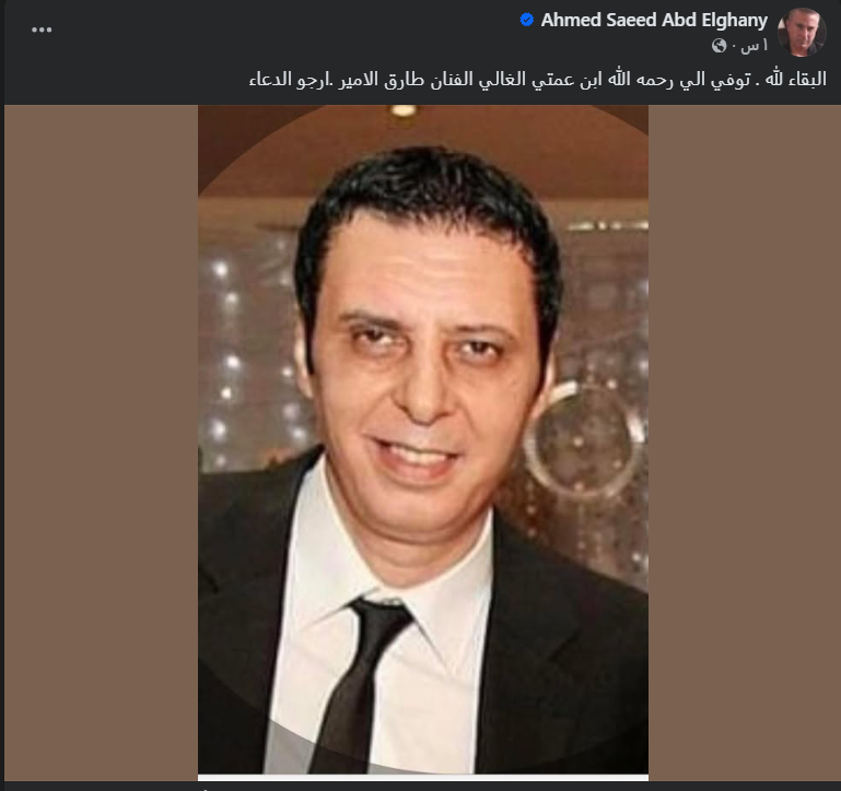 وكتب عبد الغني عبر حسابه الرسمي على فيسبوك، ناعيًا ابن عمته:"البقاء لله، توفى إلى رحمة الله بن عمتي الغالي الفنان الغالي طارق الأمير. أرجو الدعاء" .