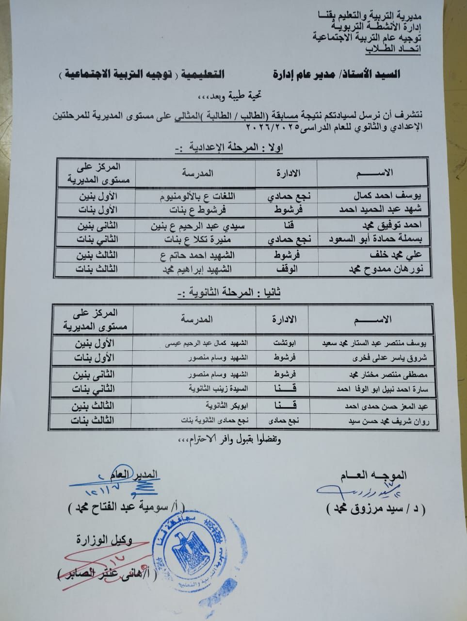 تعليم قنا تعلن نتيجة مسابقة الطالب المثالي لمرحلتي الإعدادي والثانوي