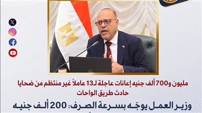 وكان معالي وزير العمل قد وجّه اليوم بسرعة صرف إعانات عاجلة بقيمة مليون و700 ألف جنيه لـ 13 عاملًا غير منتظم من ضحايا الحادث، بواقع 200 ألف جنيه لأسرة كل متوفى، و20 ألف جنيه لكل مصاب، مع التشديد على الانتهاء الفوري من الإجراءات اللازمة، والتنسيق مع مديرية العمل بالفيوم لتسليم الإعانات في أقرب وقت.
