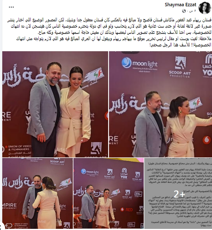 شيماء عزت كتبت على الواقعة: “فستان ريهام عبد الغفور مكنش فستان فاضح ولا مبالغ فيه بالعكس كان فستان معقول جدا وشيك، لكن المصور الوضيع اللي اختار ينشر صورة غير لائقة لفنانة أو حتى ست عادية هو اللي لازم يتحاسب ولو في أي دولة بتحترم خصوصية الناس كان هيتسجن لان ده انتهاك للخصوصية”.