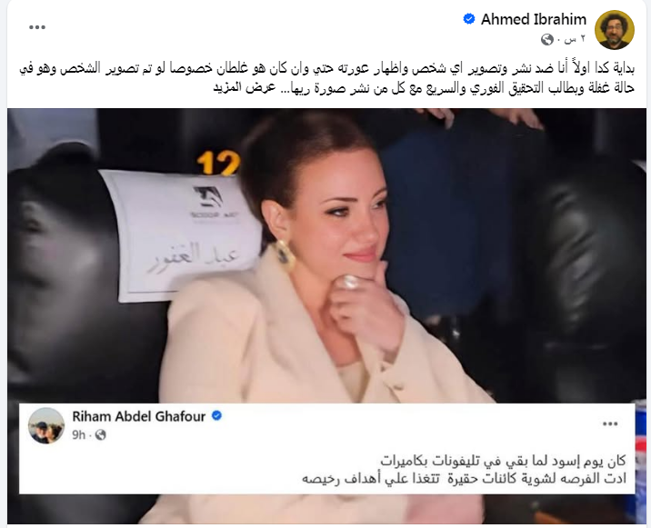 وعبر أحمد إبرهيم: “بدايةً كدا أولاً أنا ضد نشر وتصوير أي شخص وإظهار عورته حتى وإن كان هو غلطان خصوصاً لو تم تصوير الشخص وهو في حالة غفلة وبطالب التحقيق الفوري والسريع مع كل من نشر صورة ريهام عبد الغفور”.