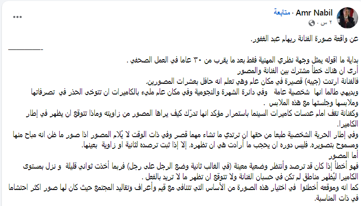 أما المصور الصحفي عمرو نبيل، فكتب: “بدايةً، ما أقوله يمثل وجهة نظري المهنية فقط بعد ما يقرب من 30 عاماً في العمل الصحفي، أرى أن هناك خطأً مشتركاً بين الفنانة والمصور؛ فالفنانة ارتدت (جيبة) قصيرة في مكان عام وهي تعلم أنه حافل بعشرات المصورين”.