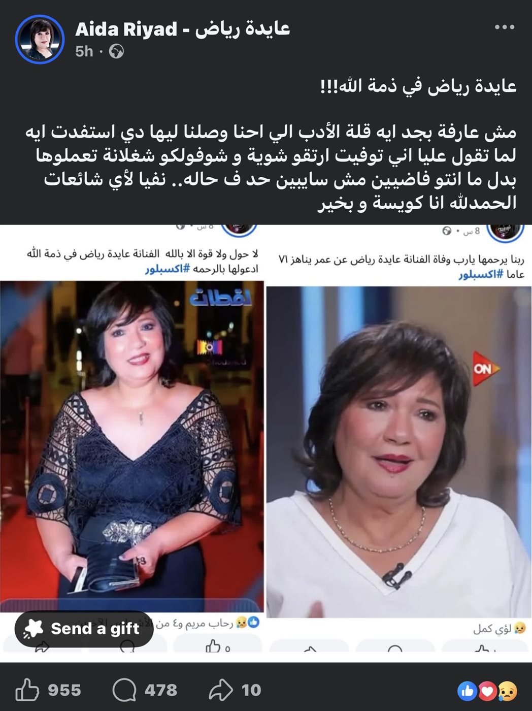 كتبت عايدة رياض: “عايدة رياض في ذمة الله!!! مش عارفة بجد ايه قلة الأدب الي احنا وصلنا ليها دي استفدت ايه لما تقول عليا اني توفيت ارتقو شوية و شوفولكو شغلانة تعملوها بدل ما انتو فاضيين مش سايبين حد ف حاله”.
