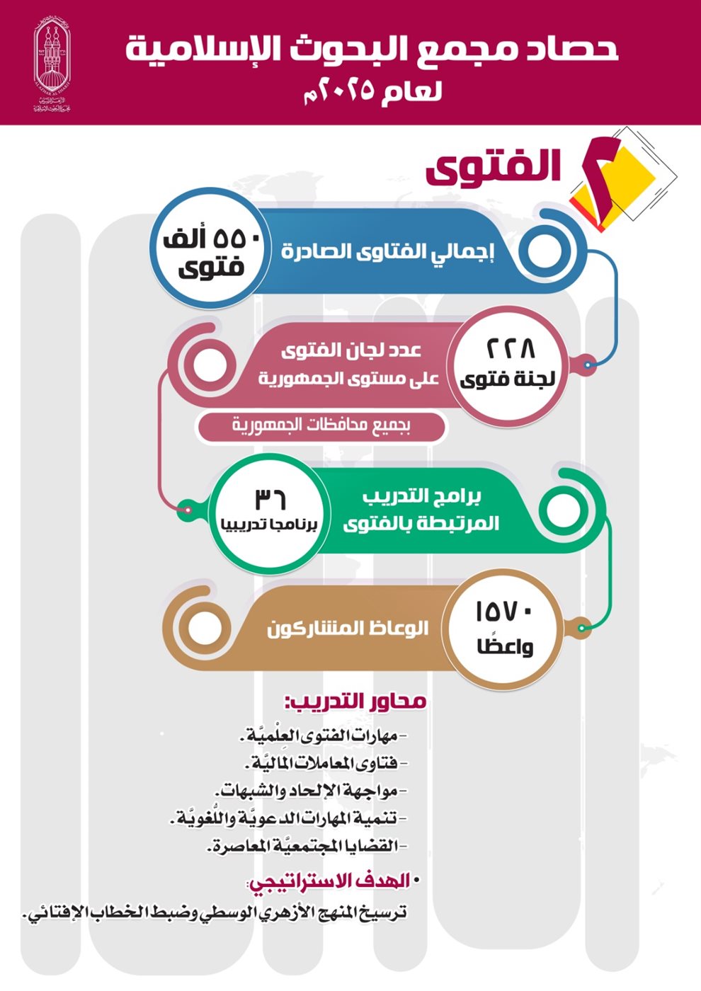 واصل مجمع البحوث الإسلاميَّة بالأزهر الشريف خلال عام 2025م أداء دوره الرِّيادي في خدمة المجتمع، مِنْ خلال منظومة فتوى متكاملة تقوم على الانضباط العِلمي، والالتزام بالمنهج الأزهري الوسطي، والاستجابة الواعية لقضايا الناس وتحديات الواقع المعاصر، بما يرسِّخ الأمن الفِكري، ويحصِّن المجتمع مِنَ الغلو والانحراف.