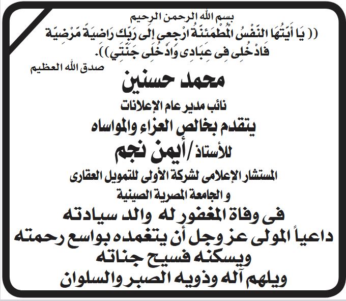 يتقدم محمد حسنين نائب مدير عام الإعلانات بجريدة الوفد بخالص العزاء والمواساه للأستاذ أيمن نجم المستشار الإعلامي لشركة الأولى للتمويل العقارى والجامعة المصرية الصينية في وفاة المغفور له والد سيادته داعيا المولى عز وجل أن يتغمده بواسع رحمته ويسكنه فسيح جناته ويلهم آله وذويه الصبر والسلوان.
