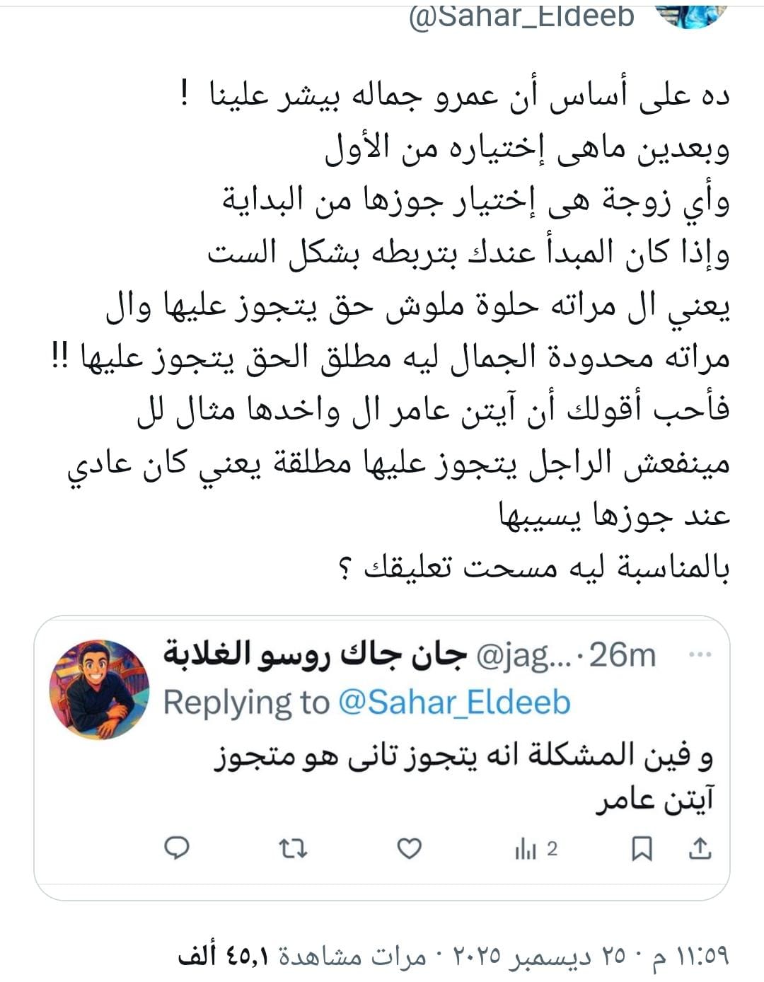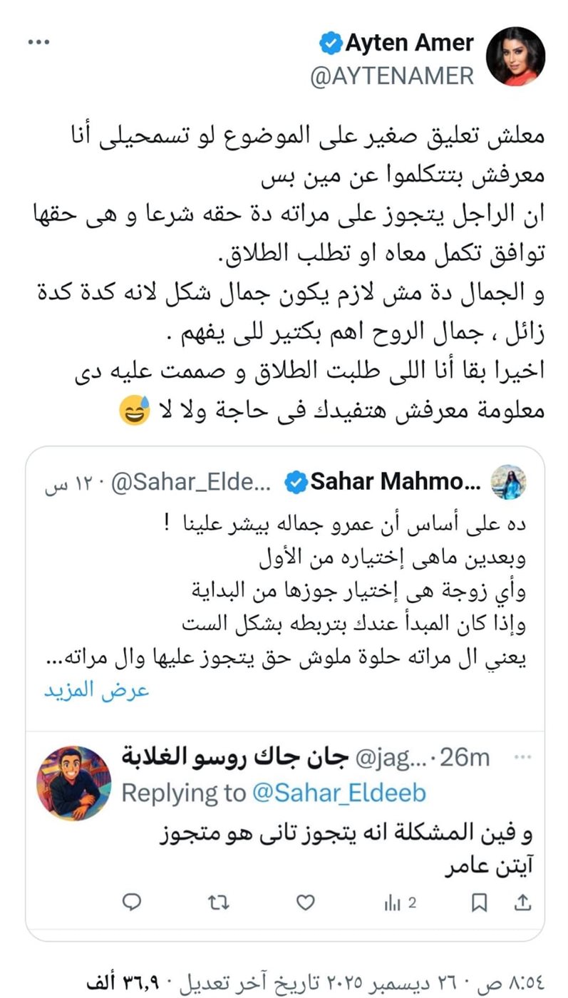 نشرت الفنانة آيتن عامر ردًا على إحدى المتابعات عبر منصة «إكس»، بعد تداول تعليق مثير للجدل حول زواج الرجل بعد الطلاق وربطه بجمال الزوجة، وكانت المتابعة أعادت نشر تعليق لشخص يرى أن الرجل يحق له الزواج مرة أخرى وفقًا لشكل زوجته، مستشهدة باسم آيتن عامر كمثال، وهو ما أثار موجة من التفاعل.