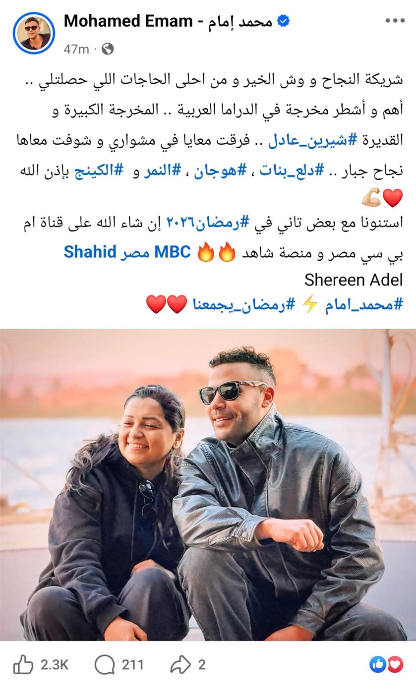 وقال إمام، في منشور عبر صفحته الرسمية على فيسبوك، إن شيرين عادل كانت السبب في تحقيقه نجاحًا كبيرًا من خلال مسلسلاته السابقة مثل «دلع بنات» و«هوجان» و«النمر» و«الكينج».