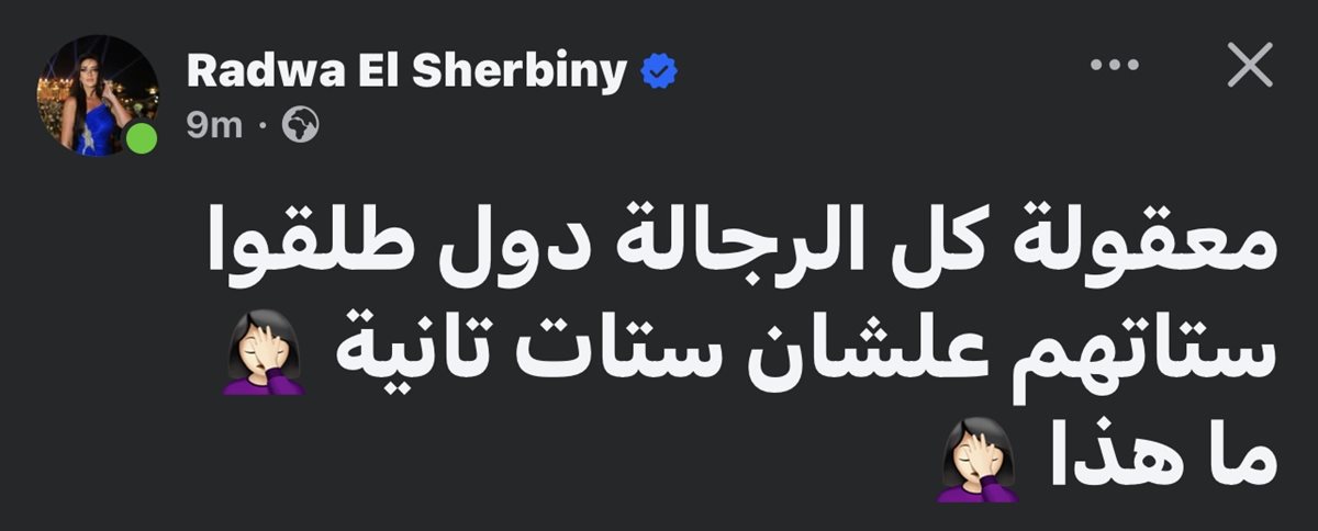 كنبت رضوى الشربيني: “معقولة كل الرجالة دول طلقوا ستاتهم علشان ستات تانية .. ما هذا؟!”، وذلك خلال منشور عبر حسابها الشخصي بموقع التواصل الإجتماعي الأشهر “فيس بوك”.
