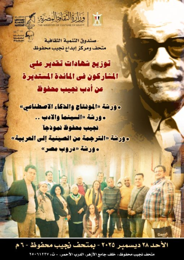 يقيم متحف ومركز إبداع نجيب محفوظ، التابع صندوق الثقافية، بتكية محمد أبو الدهب، برئاسة المعمارى حمدى السطوحى، غدًا الأحد الموافق ٢٨ ديسمبر ٢٠٢٥، حفلا لتوزيع شهادات التقدير على المشرفين والمشاركين فى الورش الفنية والسينمائية والأدبية، التى نظمها المتحف طوال شهر ديسمبر، وذلك وبمناسبة 114 عاما على ميلاد نجيب محفوظ، في تمام الساعة السادسة مساءً.