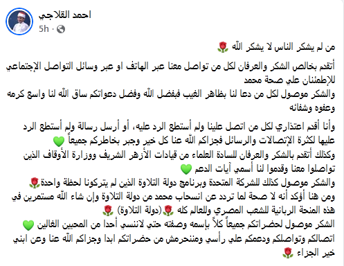 وتابع:"وأنا أقدم اعتذاري لكل من اتصل علينا ولم أستطع الرد عليه، أو أرسل رسالة ولم أستطع الرد عليها لكثرة الإتصالات والرسائل فجزاكم الله عنا كل خير وجبر بخاطركم جميعاً وكذلك أتقدم بالشكر والعرفان للسادة العلماء من قيادات الأزهر الشريف ووزارة الأوقاف الذين تواصلوا معنا وقدموا لنا أسمي آيات الدعم والشكر موصول كذلك للشركة المتحدة وبرنامج دولة التلاوة الذين لم يتركونا لحظة واحدة ".