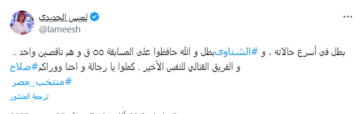 ونشرت لميس عبر حسابها الخاص على منصة "X" تغريدة أكدت فيها دعمها الكامل للمنتخب المصري، حيث كتبت قائلة: "أبطال والله حافظوا على الفوز ٥٥ ق وهم ناقصين واحد.. الشناوى بطل في أحسن حالاته، وصلاح والفريق مقاتلين للنفس الأخير. كملوا يا رجالة واحنا وراكم".