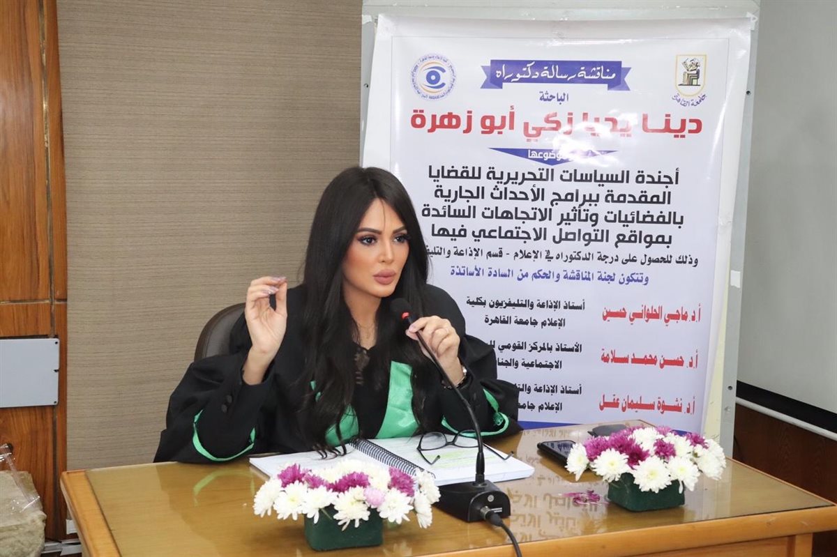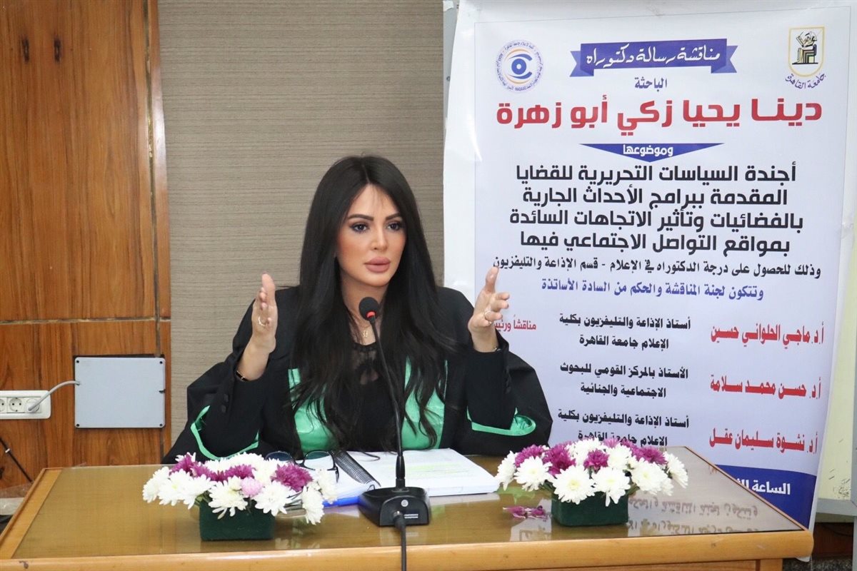 وشهدت جلسة المناقشة إشادة واسعة من لجنة الحكم، التي عبّرت عن تقديرها للمستوى المتقدم الذي قدمته دينا في رسالتها، مؤكدين أن الرسالة تُمثل إضافة حقيقية في مجال الدراسات الإعلامية.