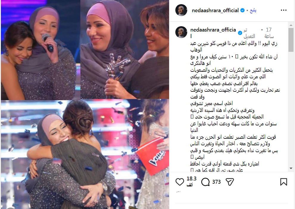 شاركت الفنانة الأردنية نداء شرارة عدد من الصور التي وثقت فوزها في برنامج المواهب الشهير ذا فويس في موسمه الثالث قبل 10 سنوات، وذلك عبر حسابها الرسمي على موقع تبادل الصور والفيديوهات الأشهر انستجرام .