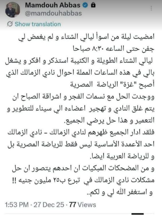 وقال عباس في منشوره: "ليالي الشتاء الطويلة جعلتني أستذكر أحوال نادي الزمالك الذي أصبح 'غزة' للرياضة المصرية".