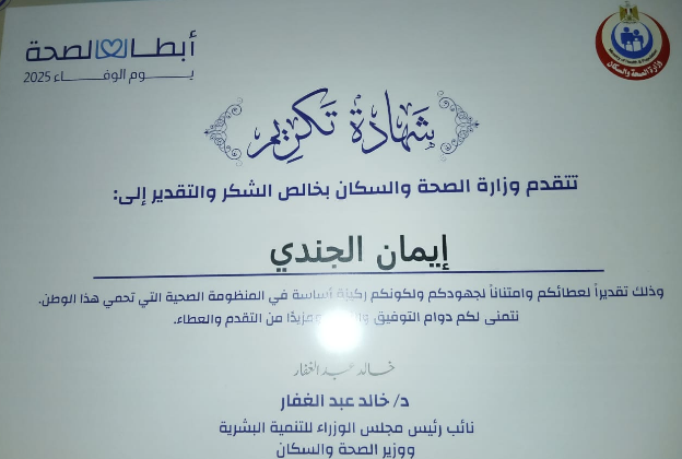 كرّم نائب رئيس مجلس الوزراء ووزير الصحة والسكان الدكتور خالد عبدالغفار، الزميلة إيمان الجندي مدير تحرير جريدة الوفد ومسؤول الملف الطبي والصحي، وذلك ضمن احتفالية «يوم الوفاء» لأطباء الصحة، التي نظمتها وزارة الصحة والسكان لتكريم نخبة من الصحفيين والإعلاميين المعتمدين لدى الوزارة والمعنيين بتغطية ملف الصحة.