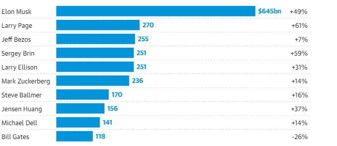 بحسب أرقام صادرة عن وكالة بلومبرج، فإن إجمالي ثروات أكبر عشرة مؤسسين ورؤساء تنفيذيين لشركات التكنولوجيا الأمريكية قفز من نحو 1.9 تريليون دولار إلى ما يقرب من 2.5 تريليون دولار خلال عام واحد فقط، حتى عشية عيد الميلاد.