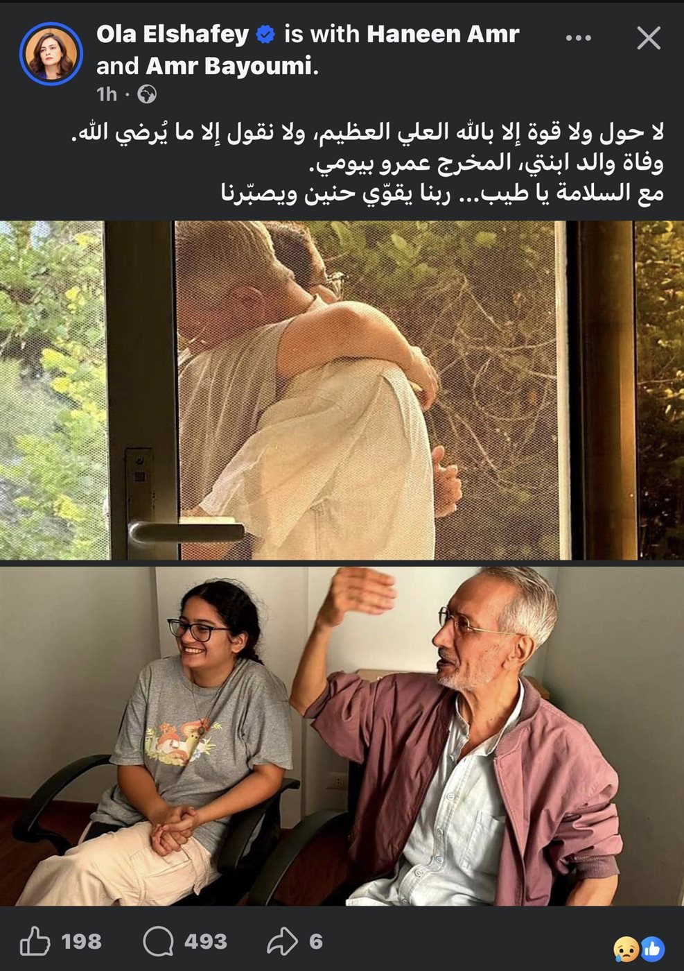 نشرت علا الشافعي صور المخرج الراحل عمرو بيومي مع ابنته حنين وأرفقتها بتعليق مؤثر قائلة: “لا حول ولا قوة إلا بالله العلي العظيم، ولا نقول إلا ما يُرضي الله. وفاة والد ابنتي، المخرج عمرو بيومي.. مع السلامة يا طيب… ربنا يقوّي حنين ويصبّرنا”.