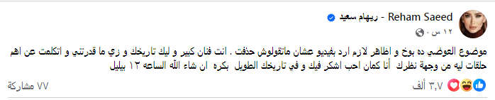 وقالت ريهام سعيد فى منشورها: "موضوع العوضى ده بوخ والظاهر لازم أرد بفيديو عشان ماتقولوش حذفت".