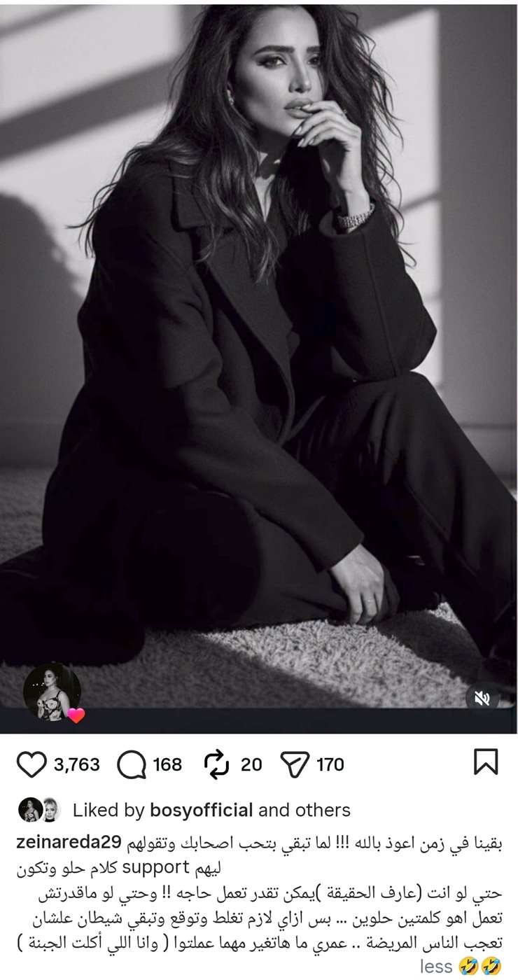 وكتبت زينة في المنشور: "بقينا في زمن أعوذ بالله! لما تبقى بتحب صحابك وتقولهم كلام حلو وتكون دعم ليهم، حتى لو مش قادر تعمل حاجة! ولازم تغلط وتوقع وتبقى شيطان علشان تعجب الناس المريضة. عمري ما هتغير مهما عملتوا، وأنا اللي أكلت الجبنة".