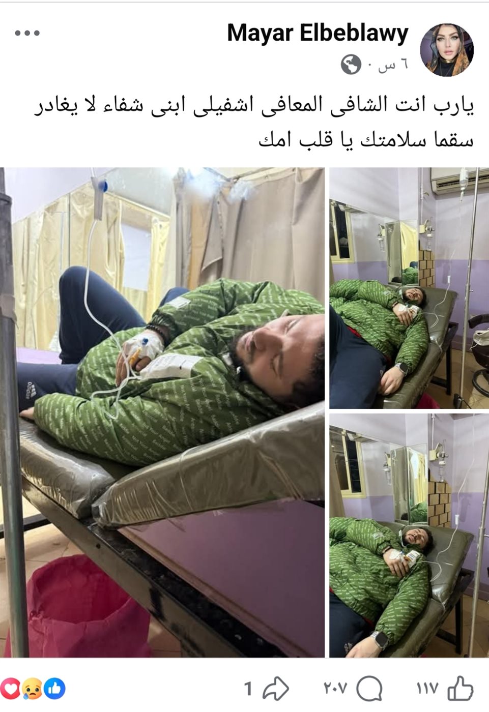 ونشرت ميار الببلاوي عبر حسابها الرسمي على موقع التواصل الاجتماعي فيس بوك: "يا رب أنت الشافى المعافى اشفيلي ابنى شفاء لا يغادر سقما سلامتك يا قلب أمك"، متمنية الشفاء العاجل لابنها ومناشدة متابعيها بالدعاء له.