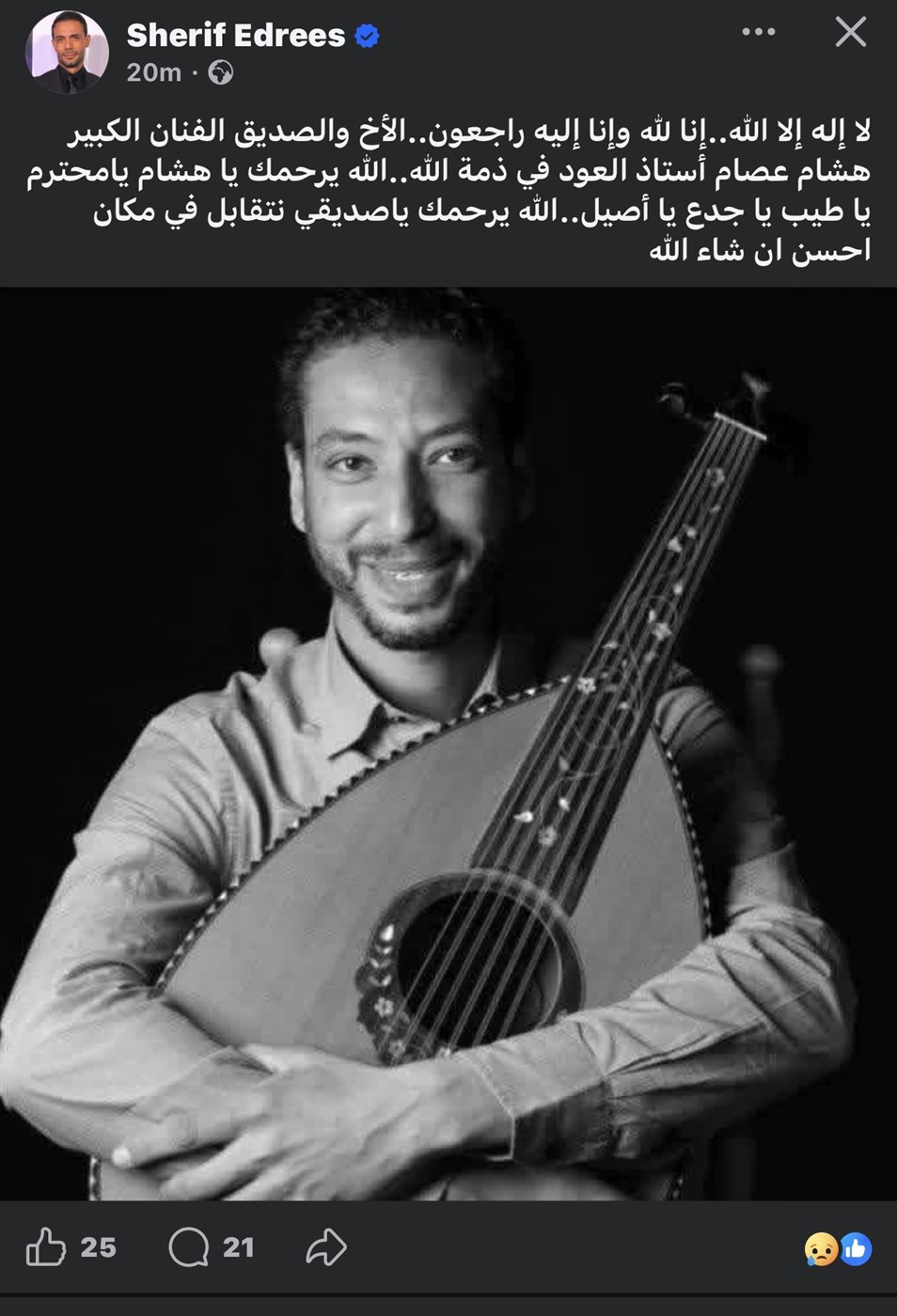 وكتب شريف إدريس: “لا إله إلا الله..إنا لله وإنا إليه راجعون..الأخ والصديق الفنان الكبير هشام عصام أستاذ العود في ذمة الله”.