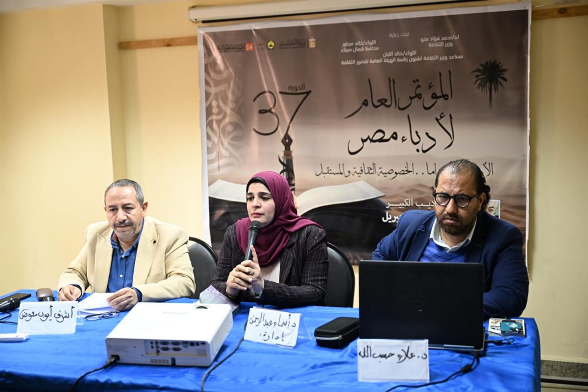 في يومه الأخير، قبيل الختام، استمرت الجلسات البحثية للمؤتمر العام لأدباء مصر في دورته السابعة والثلاثين، دورة "الأديب الكبير الراحل محمد جبريل"، والذي يعقد هذا العام تحت عنوان "الأدب والدراما.. الخصوصية الثقافية والمستقبل"، برعاية الدكتور أحمد فؤاد هنو، وزير الثقافة، واللواء الدكتور خالد مجاور، محافظ شمال سيناء، وتنظمه الهيئة العامة لقصور الثقافة، برئاسة اللواء خالد اللبان، ويرأسه الشاعر والسيناريست الدكتور مدحت العدل، ويتولى أمانته العامة الشاعر عزت إبراهيم.