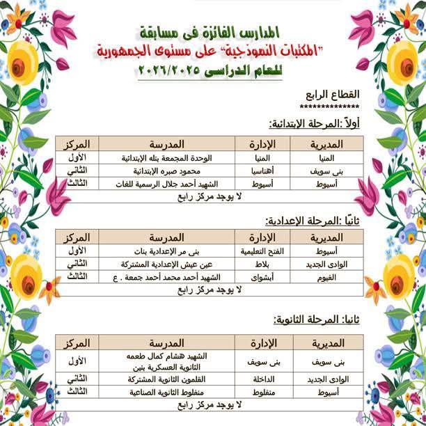 هنأ مدير تعليم أسيوط المدارس الفائزة والتي شملت مدرسة الشهيد أحمد جلال الرسمية لغات بإدارة أسيوط بالمركز الثالث للمرحلة الابتدائية ومدرسة بني مر الإعدادية بنات بإدارة الفتح التعليمية بالمركز الأول للمرحلة الإعدادية ومنفلوط الثانوية الصناعية بإدارة منفلوط التعليمية بالمركز الثالث للمرحلة الثانوية