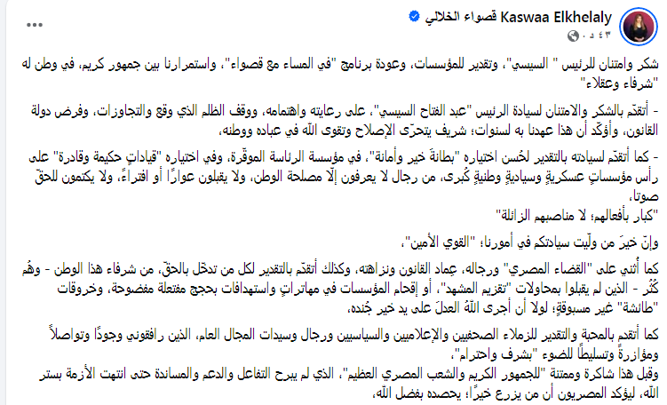قدمت الإعلامية قصواء الخلالي الشكر والامتنان للرئيس عبد الفتاح السيسي وللمؤسسات، بسبب عودة برنامج "في المساء مع قصواء" إذاعته على أحد المواقع الإلكترونية، مؤكدة استمرار البرنامج بين جمهور كريم، في وطن له "شرفاء وعقلاء".