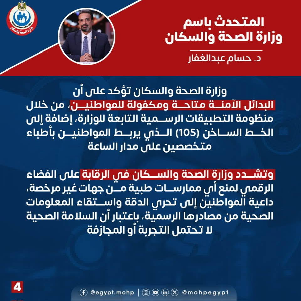 في الوقت نفسه، تؤكد وزارة الصحة والسكان على أن البدائل الآمنة متاحة ومكفولة للمواطنين، من خلال منظومة التطبيقات الرسمية التابعة للوزارة، إضافة إلى الخط الساخن (105) الذي يربط المواطنين بأطباء متخصصين على مدار الساعة.