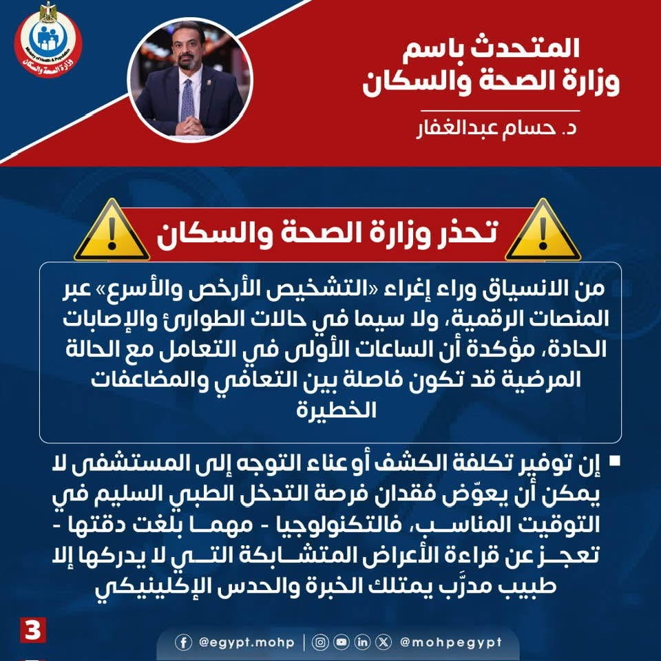 كما حذرت وزارة الصحة من الانسياق وراء إغراء التشخيص الأرخص والأسرع عبر المنصات الرقمية، ولا سيما في حالات الطوارئ والإصابات الحادة، مؤكدة أن الساعات الأولى في التعامل مع الحالة المرضية قد تكون فاصلة بين التعافي والمضاعفات الخطيرة.