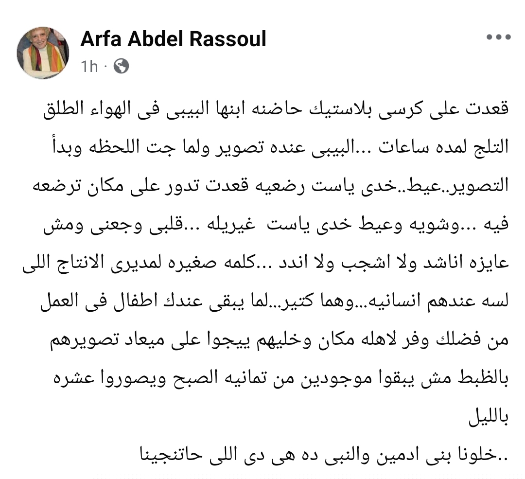 قلبي وجعني.. نداء إنساني من عارفة عبد الرسول لمديري الإنتاج في مواقع التصوير