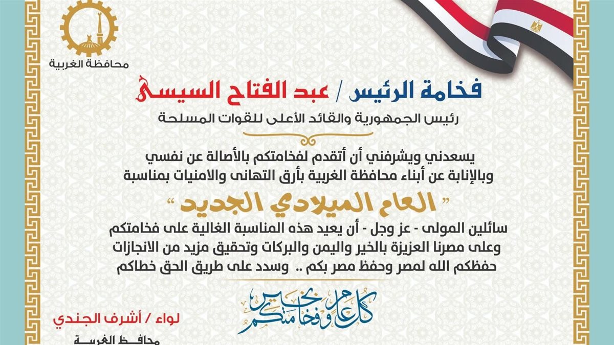 “يسعدني ويشرفني أن أتقدم إلى فخامتكم، بالأصالة عن نفسي وبالإنابة عن أبناء محافظة الغربية، بخالص التهاني وأطيب الأمنيات بمناسبة حلول العام الميلادي الجديد، داعيًا المولى عز وجل أن يعيد هذه المناسبة على فخامتكم وعلى مصرنا الغالية بمزيد من الخير والاستقرار، وأن يوفقكم لما فيه رفعة الوطن وتحقيق تطلعات شعبه العظيم. حفظكم الله لمصر وحفظ مصر بكم، وسدد خطاكم لما فيه الخير والحق.”