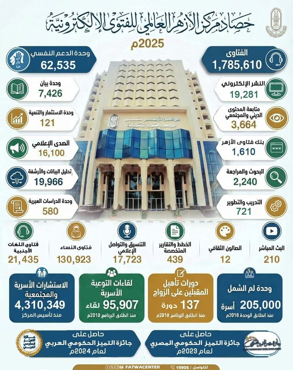 واصل مركز الأزهر العالمي للفتوى الإلكترونية أداءه العلمي والدعوي والمجتمعي خلال عام 2025م، محققًا حصادًا نوعيًّا يعكس رسالته في نشر الفهم الوسطي للإسلام، ومواكبة قضايا الإنسان المعاصر، تحت مظلة الأزهر الشريف، وبإشراف نخبة من العلماء والمتخصصين.