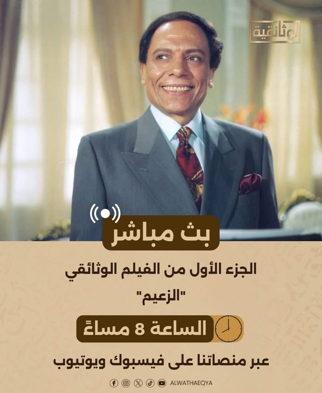 تعرض قناة الوثائقية الجزء الأول من الفيلم الوثائقي "الزعيم"، في تمام الثامنة مساءً، ويشارك في الفيلم الوثائقي "الزعيم.. رحلة عادل إمام"، عدد من أبرز نجمات الفن المصري اللاتي شاركن في رحلة عادل إمام، مثل: يسرا، لبلبة، إسعاد يونس، إلهام شاهين، سوسن بدر، شيرين، إضافة لعدد من الفنانين والمخرجين والنقاد والكتاب، منهم الكاتب والسيناريست بشير الديك، في ظهوره التليفزيوني الأخير قبل رحيله.