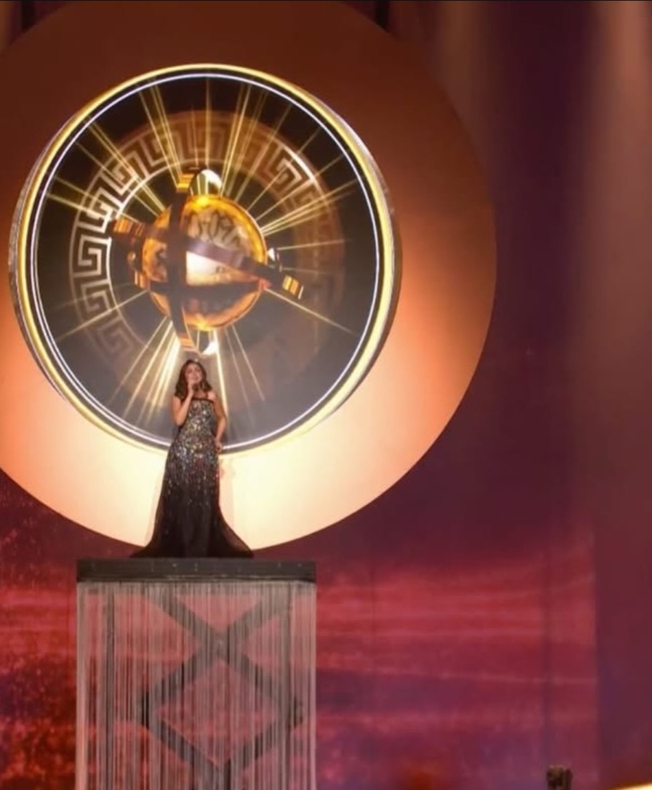 ومن الناحية الجمالية اعتمدت تسريحة شعر جذابة ووضعت مكياجا جذابًا مرتكزا على الألوان الترابية مع تحديد عينيها بالكحل والماسكرا مع لون الكشمير في الشفاه..