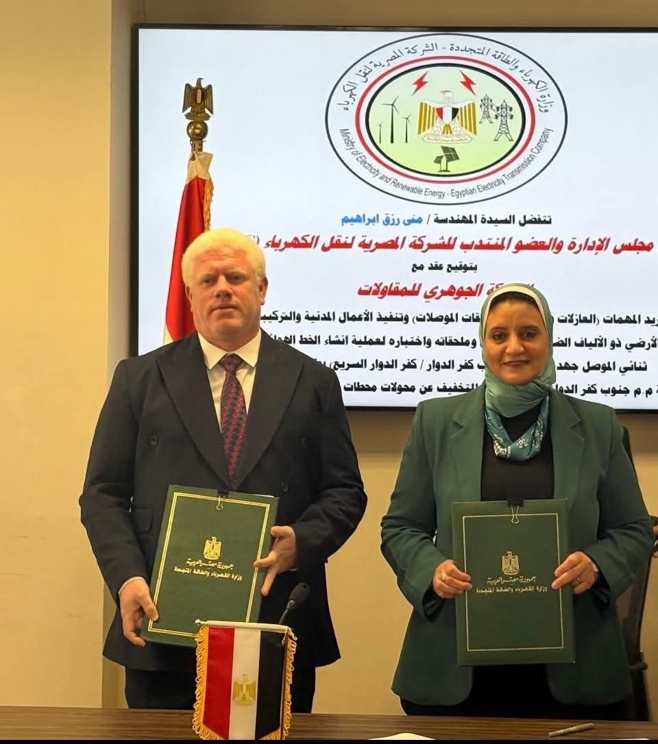 حيث وقّعت المهندسة منى رزق، رئيس مجلس إدارة الشركة المصرية لنقل الكهرباء، العقدين مع شركة الجوهري للمقاولات، ومثّل الشركة في التوقيع المهندس حاتم الجوهري، رئيس مجلس الإدارة، وذلك بحضور المهندس أحمد فتحي، رئيس قطاعات المشروعات المركزية، والمهندسة زينب قمر، رئيس قطاع المشروعات المركزية للجهد الفائق.