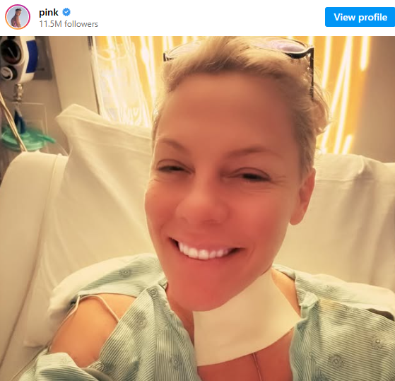 نشرت بينك صورة سيلفي من سرير المستشفى وظهرت ضمادة واضحة على رقبتها بينما حملت ابتسامة مطمئنة.