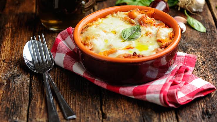 5.يُخبز الطاجن في فرن مسخن على 180° لمدة 15–20 دقيقة حتى يذوب الجبن ويكتسب الوجه لونًا ذهبيًا.
