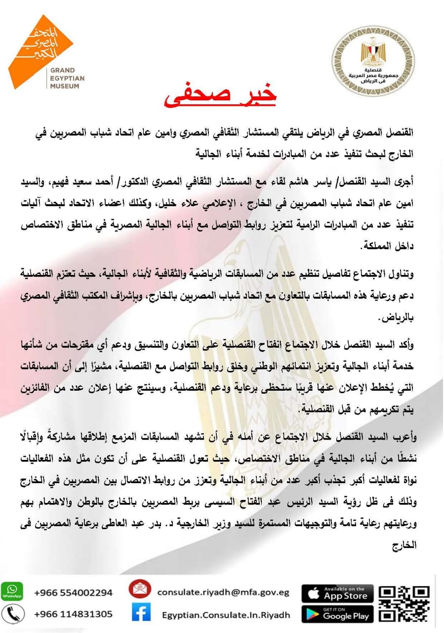القنصل المصري بالرياض يبحث مع اتحاد شباب المصريين بالخارج إطلاق مبادرات جديدة لخدمة الجالية