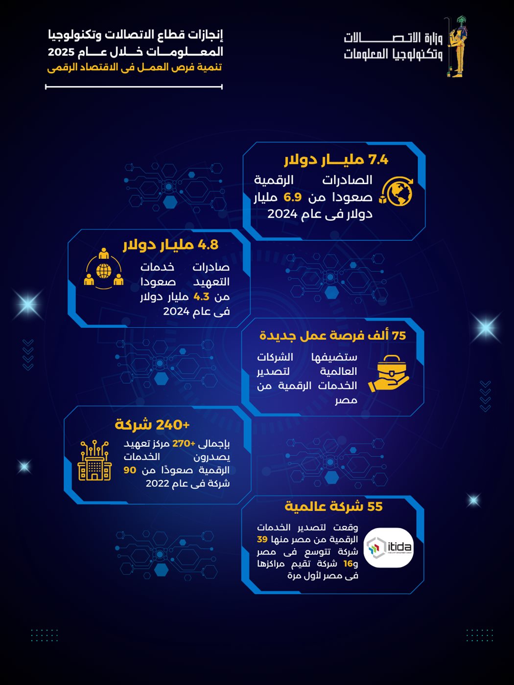 شهد قطاع الاتصالات وتكنولوجيا المعلومات في مصر خلال عام 2025 قفزات كبيرة في تطوير صناعة التعهيد ودعم المهنيين المستقلين، ضمن استراتيجية وطنية لتعزيز الاستثمار، وتوفير فرص العمل، وصقل المهارات المحلية بما يتوافق مع متطلبات السوق العالمية.