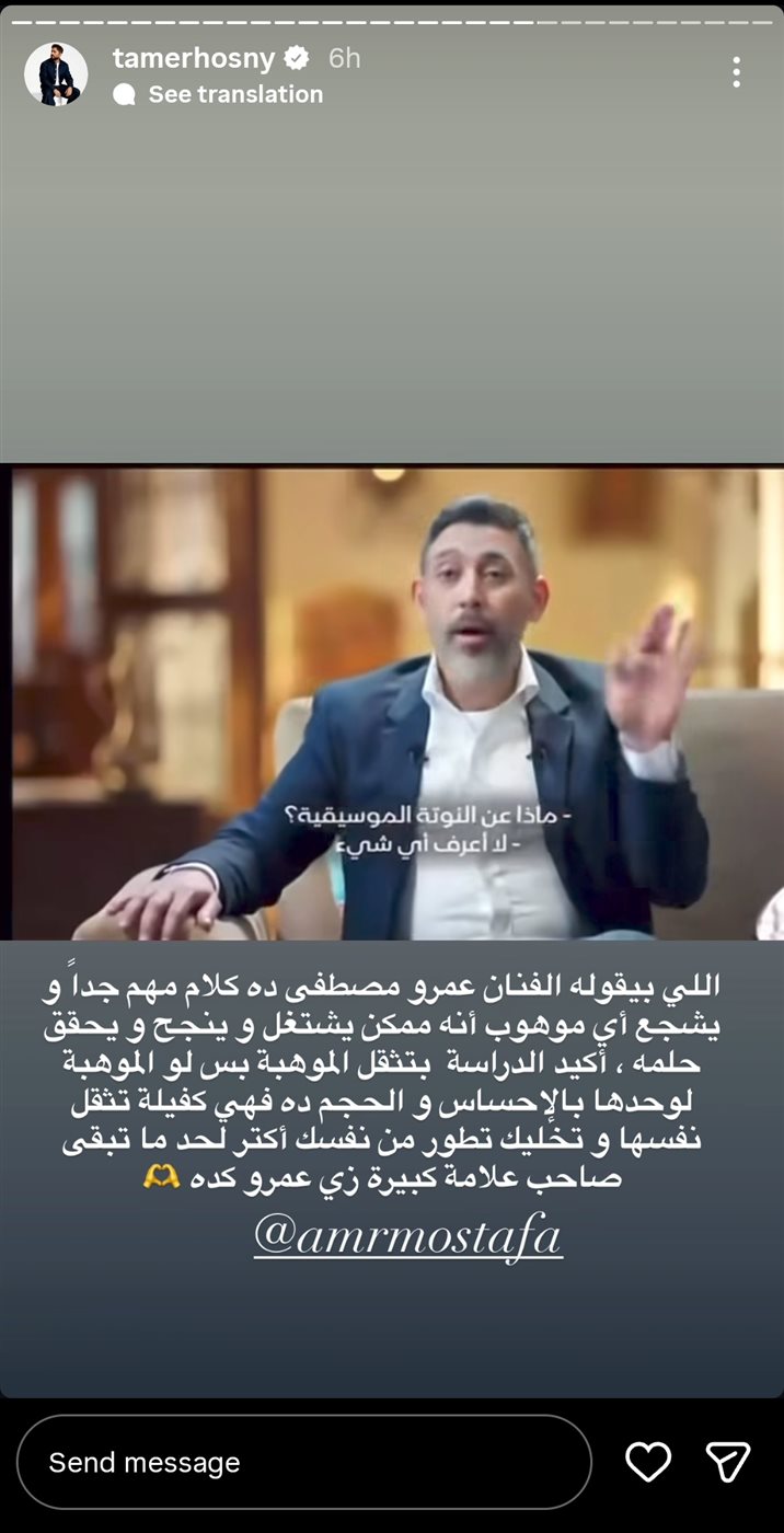وعلق تامر حسني على الفيديو قائلاً: "اللي بيقوله الفنان عمرو مصطفى ده كلام مهم جدًا ويشجع أي موهوب أنه ممكن يشتغل وينجح ويحقق حلمه، أكيد الدراسة بتثقل الموهبة.