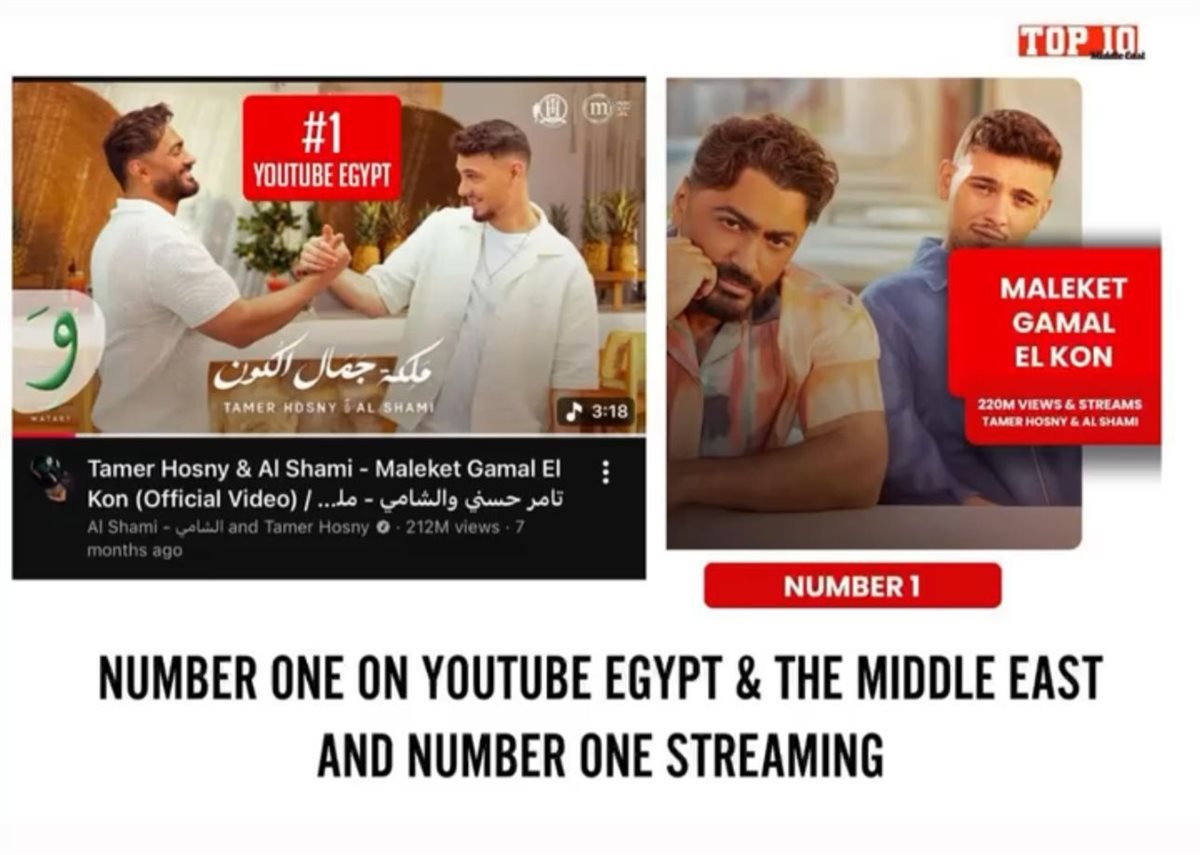 حصد النجم تامر حسني المركز الأول في عام 2025 بأعلى نسبة مشاهدة واستماع لفنان مصرى على يوتيوب وتوب 10 ميدل إيست بأغنية ملكة جمال الكون التي يتعاون فيها مع الفنان السوري الشامي، حيث حققت 212 مليون مشاهدة على موقع الفيديوهات الأشهر عالميًا يوتيوب.