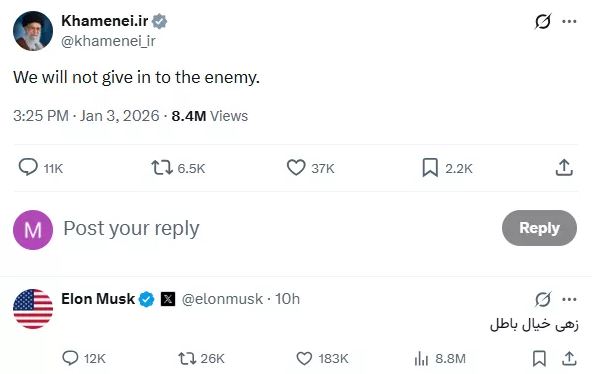 نشر حساب المرشد الإيراني، علي خامنئي، تدوينة باللغة الإنجليزية شدد فيها على أن إيران "لن تستسلم للعدو"، قبل أن يرد عليه إيلون ماسك مباشرةً بتعليق باللغة الفارسية قال فيه: "زهي خيال باطل"، وهي عبارة تُستخدم للدلالة على "أوهام"، أو "خيال لا أساس له" أو "أضغاث أحلام".