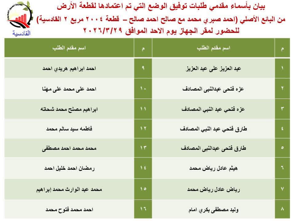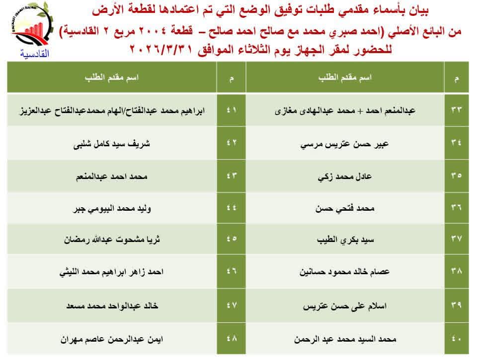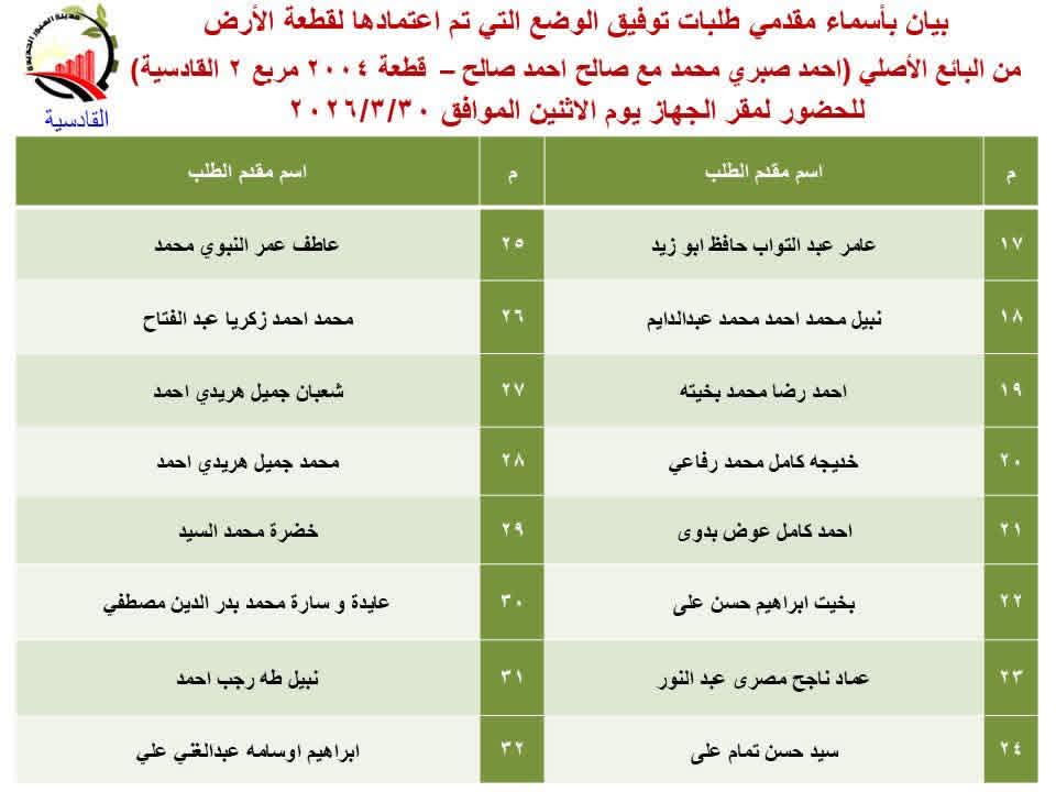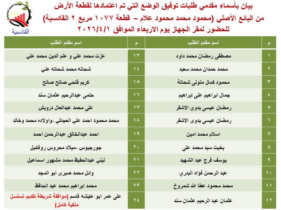 أعلن جهاز مدينة العبور الجديدة أسماء دفعة جديدة ممن تم اعتماد توفيق الأوضاع لهم بمنطقة القادسية سابقاً، وذلك لمراجعة الجهاز، على أن يكون معهم أصل بعض المستندات.